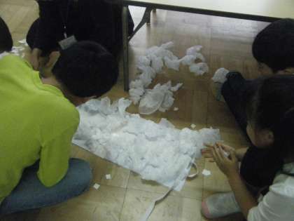 みんなで白いお花紙や綿を貼りつけました。『あったかそうなてぶくろ』になりました。