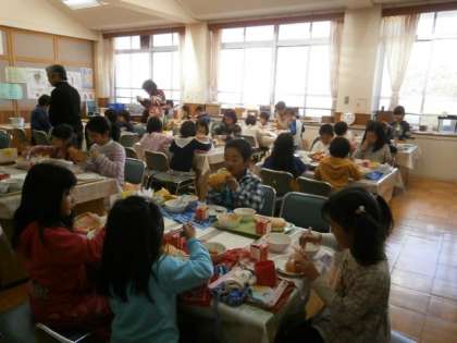 2年生と伏見南浜幼稚園の年長園児さんとの給食交流がありました。2年生のお兄さんお姉さんが給食の準備・手の洗い方・給食の食べ方など優しく教えていました。幼稚園の子どもたちもおいしそうにホットドッグを食べていました。