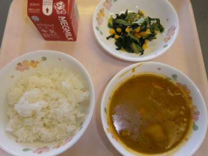 今日の給食は,みんなの大好きな『カレー』でした。お肉は「鶏肉」を使ったので『チキンカレー』です。