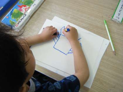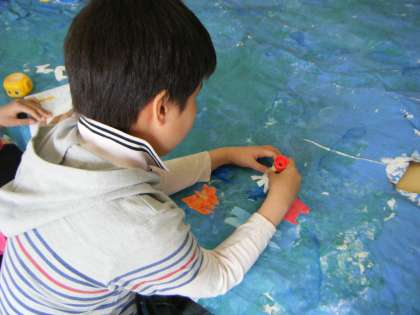 少し前に,手足を使って,模造紙に青い海の色を塗りました。今日は,魚や海の生き物を描いて,たくさん貼りました。