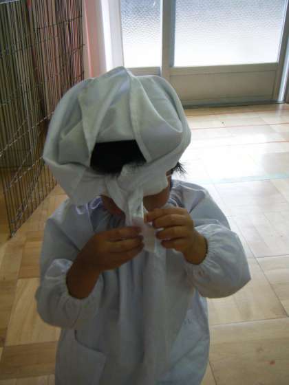 一生懸命自分で三角巾をつけようとしている姿がかわいいですね。