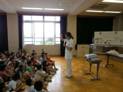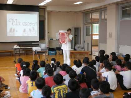 6月11日(火)2校時に,4Fワーキングルームにてつくし学級・2年生対象に「歯磨き指導」が行われました。歯科衛生士の方に来ていただき,“歯の大切さ”“効果的な歯の磨き方”などを教えていただきました。