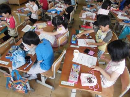 6月13日(金)に一年生が歯みがき指導を行いました。虫歯になる原因について考えたり,正しい歯のみがき方をやってみたりと楽しく学習することができました。