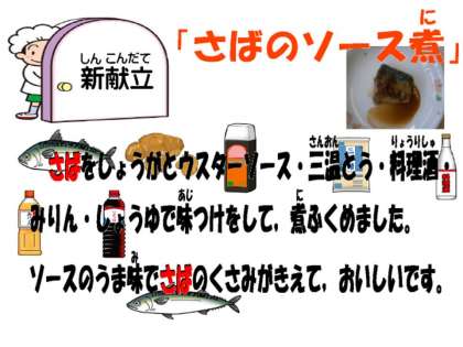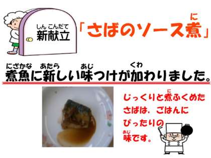 今日の給食は,「煮魚に新しいメニューが加わりました。」ということで,新献立『さばのソース煮』が登場しました。