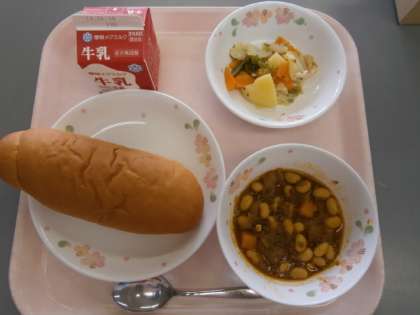 『チリコンカーン』は,大豆料理の中では人気のある献立です。副菜の『野菜のホットマリネ』は,りんご酢を使ったさっぱりとした献立です。さすがは高学年 好き嫌いはあると思いますがしっかり食べられていました。ごちそうさまでした。