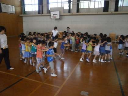 児童と園児の「名刺交換」からはじまり,「貨物列車」や「猛獣狩りゲーム」など楽しいイベントを通して,お互いに仲良くなれる機会となりました。