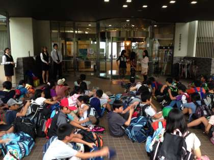 長いバスの旅でした。これから,おいしい食事を食べて,お風呂に入って,ともだちとの楽しい時間を過ごします。お土産を買いに行くのももうすぐです。