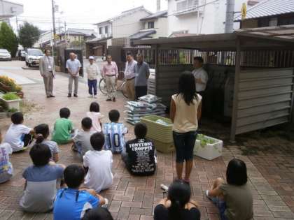園芸委員会の児童が出席し,グリーンカーテンのためのゴーヤの苗,プランター,土(肥料)をいただきました。