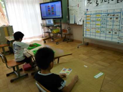 模様を作る子どもたちは,今までは机に置いていた完成写真を,テレビ画面に映すことにしました。遠くのものを見て,手元を見て・・・と目を動かしながらの作業は難しいものですが,集中して取り組んでいました。