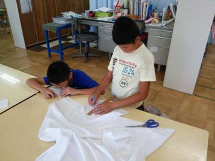 家庭科の復習をしている6年生が作っているのは,10月に行われる合同運動会のゼッケンです。次は,ミシンを使って布のまわりを縫っていき,9人分のゼッケンを作ります。