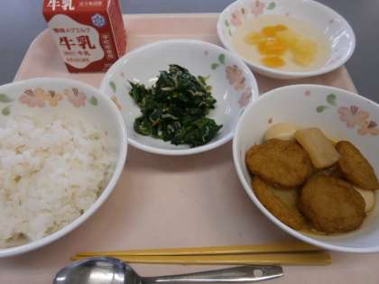 主菜は,たらのすり身で作られた「平天」が人気の『平天とこんにゃくの煮つけ』で,副菜は,「ほうれん草」と「じゃこ」を使った『ほうれん草とじゃこの炒め物』でした。