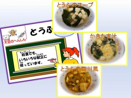 今日の給食は,ツルンとのど越しの良い「はるさめ」の入った『とうふのスープ』でした。大豆の変身「とうふ」のできるまでを,給食カレンダーや電子紙芝居「給食室からこんにちは」で紹介しまして,どんな料理に「とうふ」が使われているか,みんなで考えました。3年生は国語で「すがたをかえる大豆」の学習をします。もっともっと興味を持ってもらえるとうれしいです。