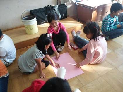 1年生と2年生を招待して,一緒に遊ぶつくしまつりを計画しています。子どもたちひとりひとりが1つのコーナーを担当し,ルールや道具を作っているところです。4年2組と4年3組に来てもらい,一緒につくしまつりの準備をしました。