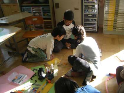 今回は5年1組との交流です。つくし学級には5年生がいないので,1番交流機会が少ない学年です。つくしの子どもたちとどんな風にかかわっていいのか困るかな・・・と心配しましたが,とても丁寧に声をかけてくれたり,作り方をゆっくり教えてくれたりと,さすが高学年でした。