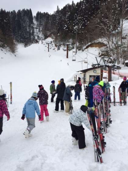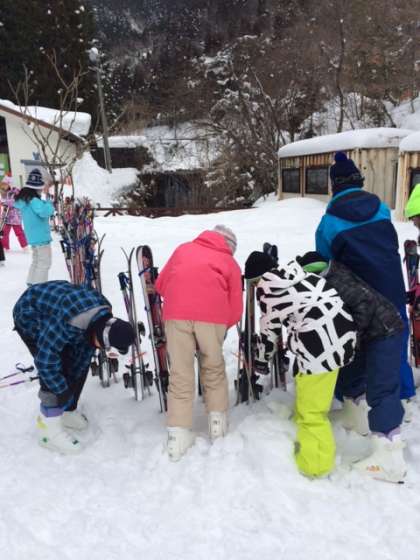 広河原スキー場につきました。ゲレンデは真っ白でとてもいい雪です。スキーの板とストックは先にスキー場に運んでいただきました。たくさんのスキー板が立てられていますが,まずは,自分の物を探します。早く滑りたくて,みんなうずうずしています。