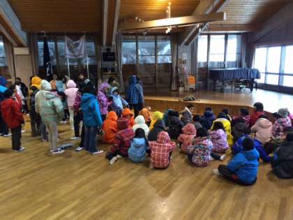 お借りしていたスキー板を片付けます。すごい雪が降っていて,除雪車も出ています。この雪の世界とは,今日でお別れします。楽しい活動がたくさんできました。