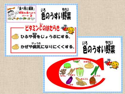 今日は,給食カレンダーや電子紙芝居「給食室からこんにちは」では,色のうすい野菜について学習しました。今日の「たまねぎ」・「キャベツ」・「コーン」が色のうすい野菜で,ビタミンCを多くふくむ野菜でした。