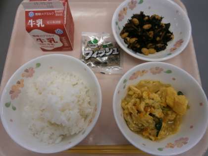 副菜は,不足しがちな「大豆」と「ひじき」を使った『ひじき豆』でした。京都では,昔から食べられてきた「おばんざい」の1つで,成長期の子どもたちには,しっかり食べてもらいたい献立の1つでもあります。