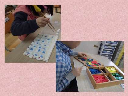 お箸でスポンジをつまむ,大工キットで釘打ちの練習など,個々に応じた課題に取り組みました。