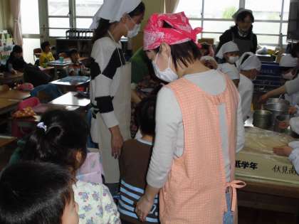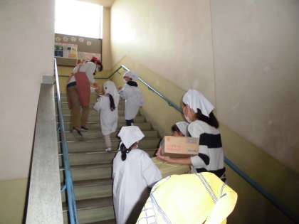 年度当初1年生の給食運搬や配膳のお手伝いに保護者のみなさんが来ていただいています。