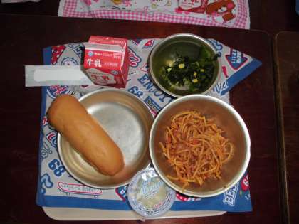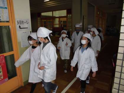 1年生は初めての給食です。当番のエプロンも少し大きめですが,しっかり給食当番をしてくれていました。