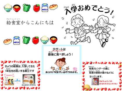 今年度も電子紙芝居「給食室からこんにちは」や給食カレンダーを使って,その日の給食の事を子どもたちに伝えていきます。