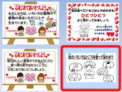 給食カレンダーや電子紙芝居「給食室からこんにちは」で,心をこめて食事のあいさつすることの大切さを伝えました。おいしく味わうコツも知って,味わって食べられたので,たくさんの感想が届きました。