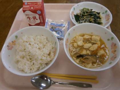 今日の給食は,豆腐料理『五目豆腐』でした。