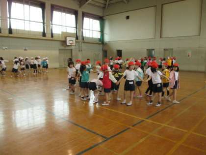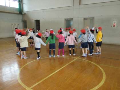 雨が降り,体育館で「体ほぐしの運動」を行いました。手をつないだチェーンが切れることなく,クラス全員で『なべなべ そこぬけ』をしました。初めは無理にひっぱったり,押してしまったりと,力のかけ具合が分からなかったようですが,次第にうまく輪を返すことができました。