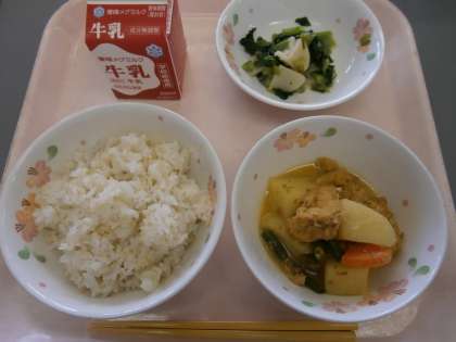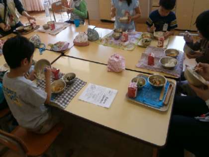 大人好みのメニューかなと教室に行ってみましたが,つくし学級のこどもたちは,「今日の麦ごはんおいしい。」と言ってくれていました。姿勢よく,上手におはしを使って食べていました。子どもたち同士が励ましたり,声かけをしたりと温かい空気でいっぱいでした。きっと苦手な献立も,少し頑張ってみようという気持ちにさせてくれるんだろうな,安心して食事と向き合える雰囲気を感じました。