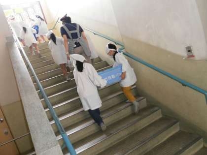 伏見南浜小学校では,つくし学級以外は,給食室サービスホールを出るとすぐ階段を上るというハードルが待っています。つまり2回以上に教室があるということです。5年・6年は4階まで給食を運ぶことになります。運搬中の子どもたちの安全には担任も最善の注意を払っています。