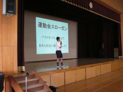 今年度の児童会目標と,運動会のスローガンを,児童会の代表から全校児童に伝えてもらいました。