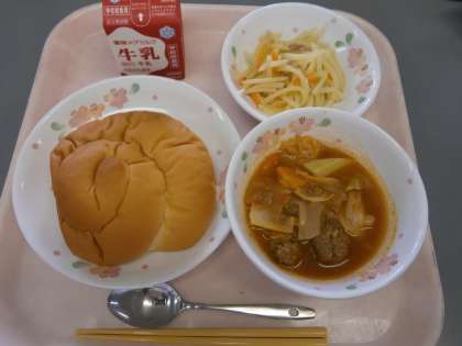 今日の給食は,手作りの味『ミートボールとキャベツのトマト煮』でした。