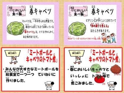 「今日のミートボールとキャベツのトマトにがおいしかったです。パンが,あまかったです。じゃがいものソテーがあいしくて,しゃきしゃきしてました。また,作ってください。」・・・4の2