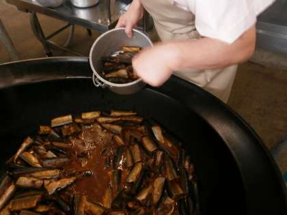 2つの大きな回転釜を使って煮汁といっしょに煮ます。