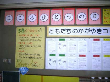 毎月朝会のあとに「こころひとつの日」の道徳につなげる取り組みを行っています。