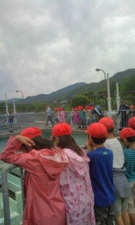 浄水場のいろいろな仕組みを見学中です。沈殿池など工夫がたくさん施された施設を見て回り,学習しています。