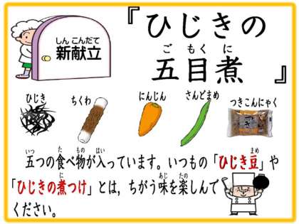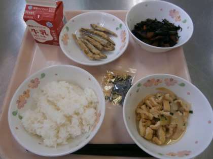 今日の給食は,セルフ丼『きつね丼』と頭から丸ごと食べられる『きびなごのからあげ』,そして,新しい献立『ひじきの五目煮』でした。