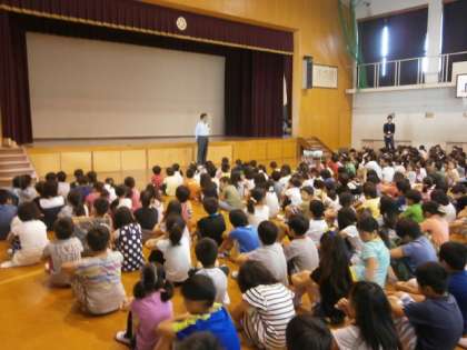 校長先生の声に合わせ,体育館の天井を突き抜けるくらい大きく元気なあいさつで始まった朝会の様子です。 校長先生から自分から大きな声で相手の名前を呼んで気持のよい挨拶をすることの大切さのお話がありました。