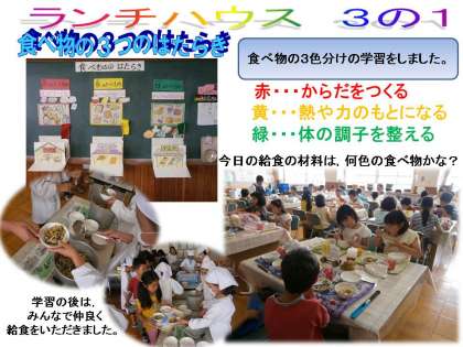 ランチハウスでは,学年のテーマで学習した後,いつもと違う強化陶磁器の食器で給食をいただきました。3年生は,食べる量が,主食・主菜副菜とも少し増えていますが,「食べ物のはたらき」を学習したこともあり,全員しっかり食べることができました。