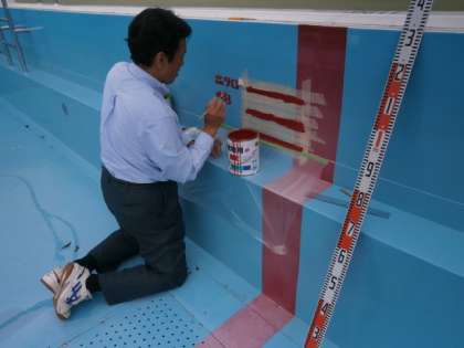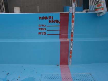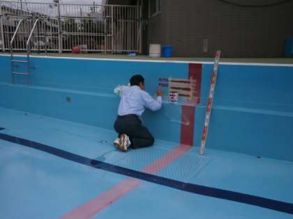 学校長が,子どもたちの安全な水泳学習のために,水位のラインを入れました。水泳学習は,今週から始まります。プールの準備は万全!あとは,天候が味方してくれれば,水泳を楽しく学習してくれることでしょう。
