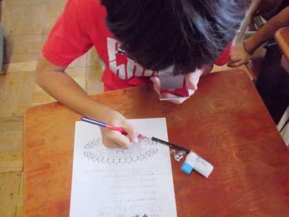 カラーテスターで染め出して赤く色のついているところを鏡で見て歯の図に記入しました。
