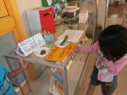 食育コーナーに展示された「まんがんじとうがらし」「みょうが」をさわってみたり,臭いをかいでもたり体験しました。