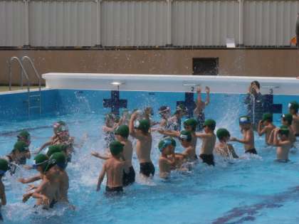 今日は,気持のよい天気になり,1年生の子どもたちが水泳学習を楽しんでいます。大きなプールに早くなれて,安全に活動を進めていきましょう!
