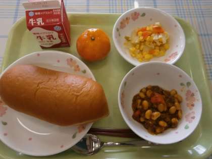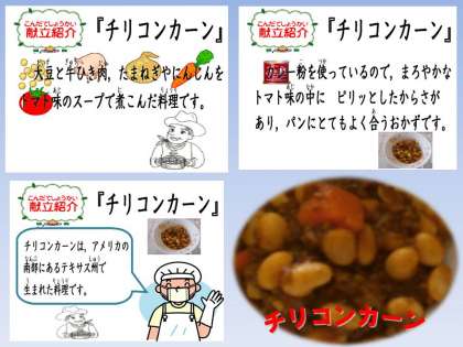 今日の給食は,豆料理『チリコンカーン』でした。家庭であまり食べられなくなった「大豆」を食べやすいように,アメリカ南部のテキサス州で生まれた料理『チリコンカーン』にしてみました。中間休み廊下であった5年生が,「カレーの良い匂いや,カレーですか?」と聞いてくれました。となりにいた友達が「今日はチリコンカーンやで。」というと,「やったー ぼくチリコンカーン大好きやねん。」「おれも」といって教室に戻っていきました。