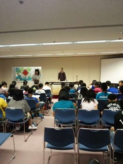 語り部さんのお話を聞いています。当時の体験を直接聞くとてもよい機会で,子どもたちは真剣な面持ちで耳を傾けています。