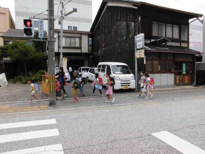 路側帯の無い通りもあり,狭い一方通行もありますので,角々には見守りの保護者の方々や地域のみなさんが立ってくださっています。