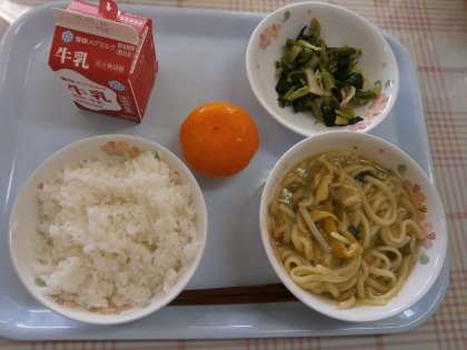 台風の接近からか 蒸し暑い日が続いています。熱い時には冷たい物やのど越しの良い物が好まれますが,暑い時こそ熱いものを食べて,暑さを吹き飛ばし乗り切ることも大切です。そんな日にぴったりの献立が今日の,『カレーうどん』・『みかん(冷凍)』です。