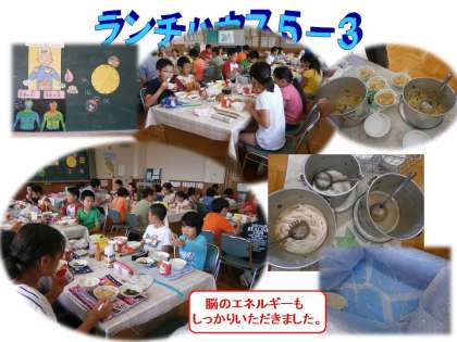 「カレーうどんはピリりとからくて,おいしかったです。かまぼことこまつなのいためものは,わさびのあじがして ツーンときたけれどおいしかったです。みかんは,きんきんでつめたくておいしかったです。」・・・5の2