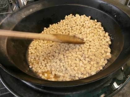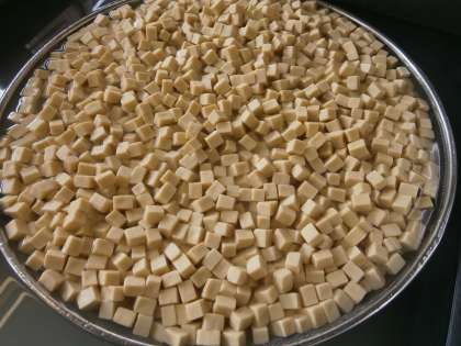 高野豆腐を水でもどして,けずりぶしでとっただし汁に砂糖と醤油を入れて煮ておきます。